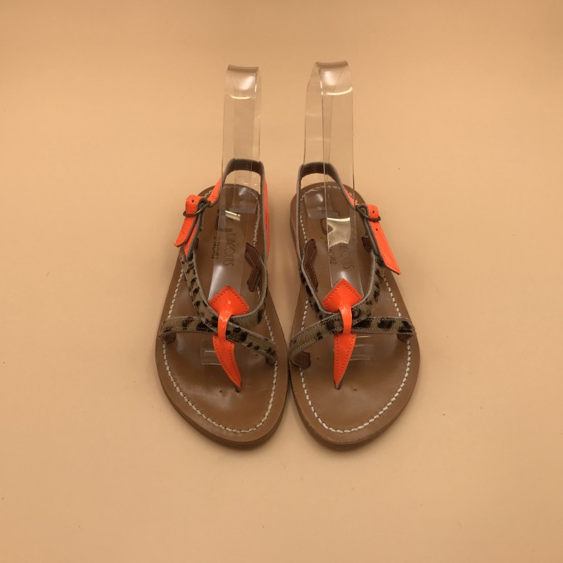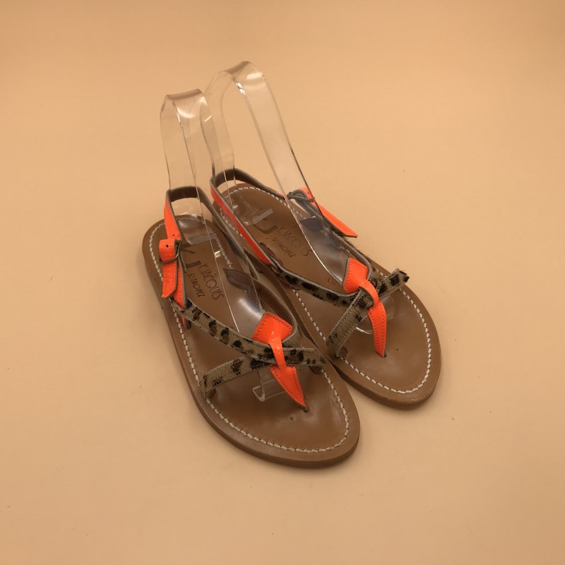 K.Jacques flat sandals, ORION Model, Neon Patent Orange Printed leopard Leather size 35.