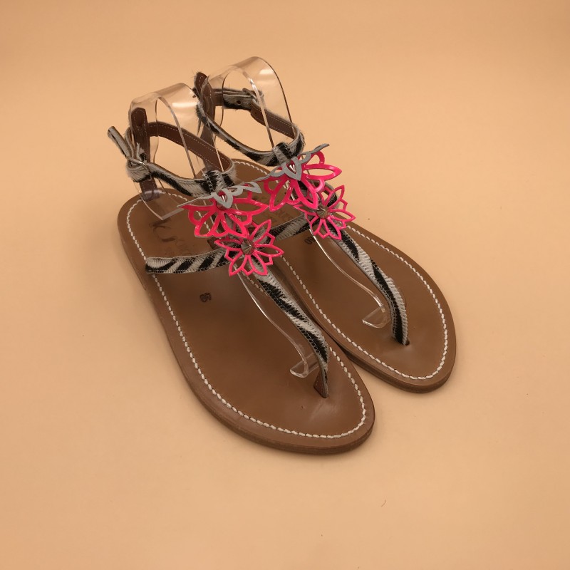 K.Jacques flat sandals, HELIOTROPE Model,Printed zebra and Neon Patent Pink Leather Size 40.