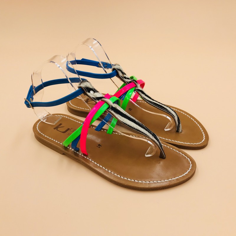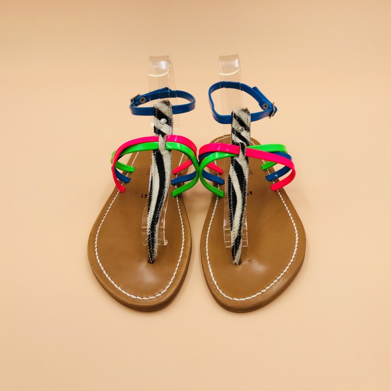Sandales plates K.JACQUES, modèle PAPYRUS en cuirs Imprimé Zèbre Fluo Rose Bleu Vert pointure 41.