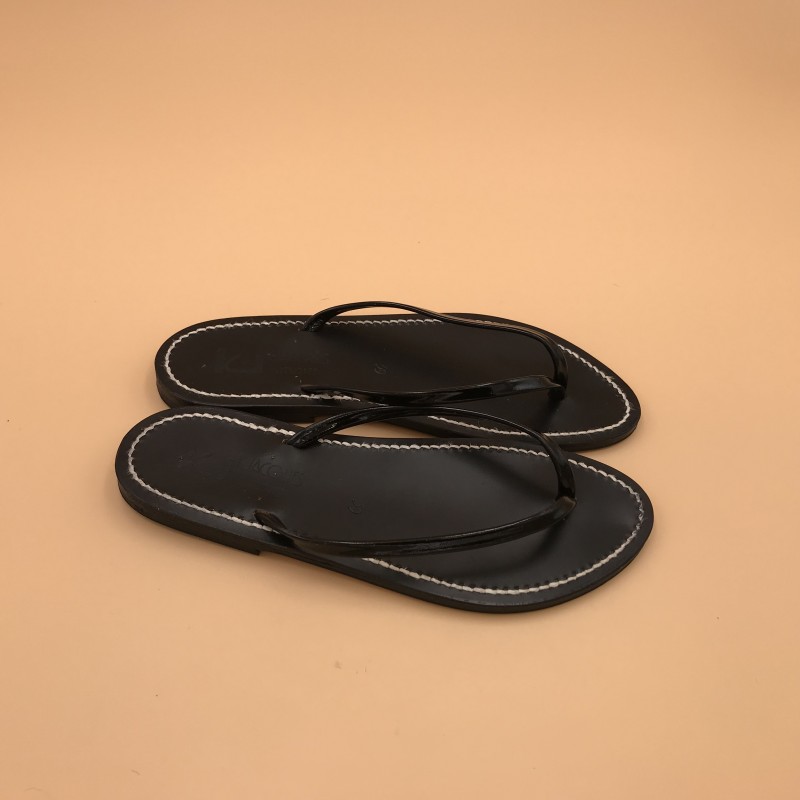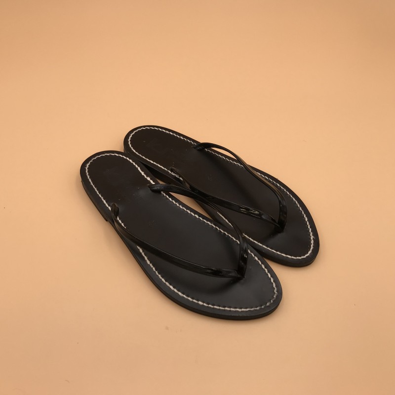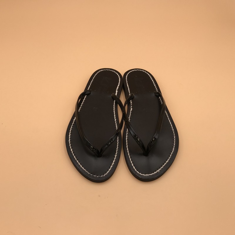 Sandales plates K.JACQUES, modèle VENISE Semelle noire Fil Blanc en cuir Vernis Noir , pointure 39.