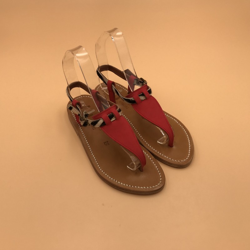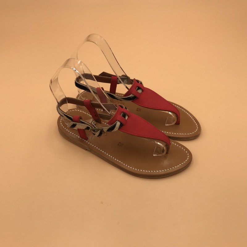 Sandales plates K.JACQUES, modèle CORIOLAN en cuir Nubuck Rouge et Imprimé Zèbre, pointure 35.