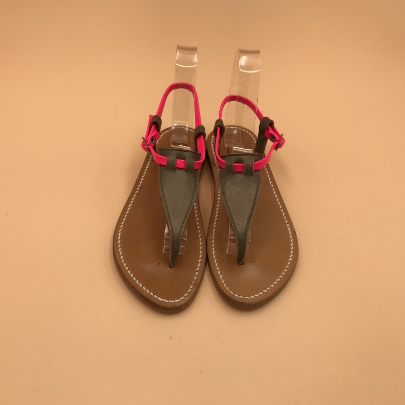 Sandales plates K.JACQUES, modèle CORIOLAN en cuir Velours Métal Italiano fluo rose, pointure 37.