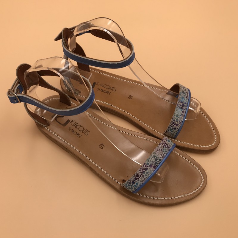 Sandales plates K.JACQUES, modèle LAURA en cuir Dover Aqua et son liseré en cuir Satiné China , pointure 40.