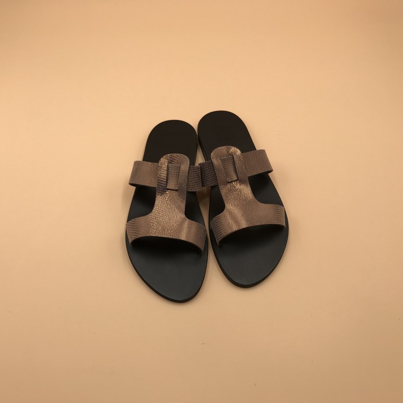 Sandales plates K.JACQUES, modèle NEMEE en Epure Noir en cuir Disco Bronze, pointure 39.