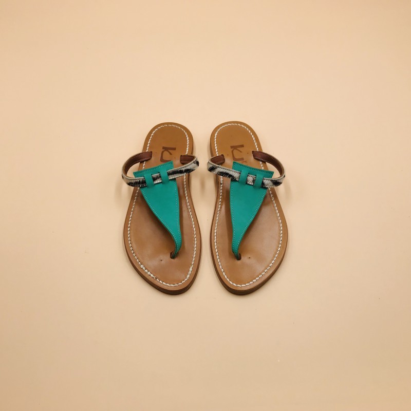 Sandales plates K.JACQUES, modèle COLUMBIA en cuir Nubuck Menta et Imprimé Zèbre, pointure 36.