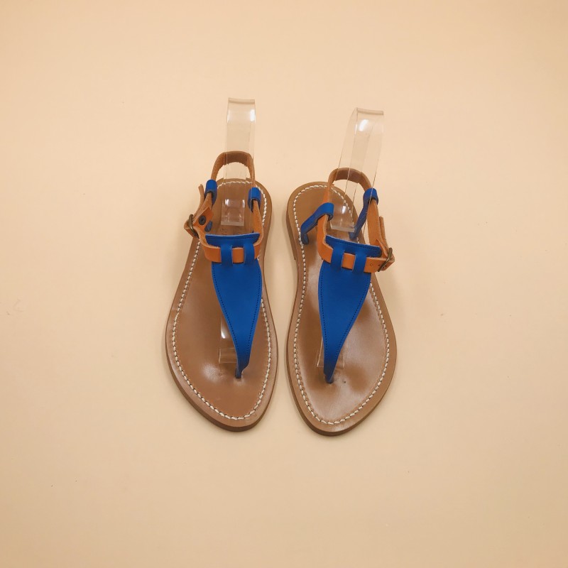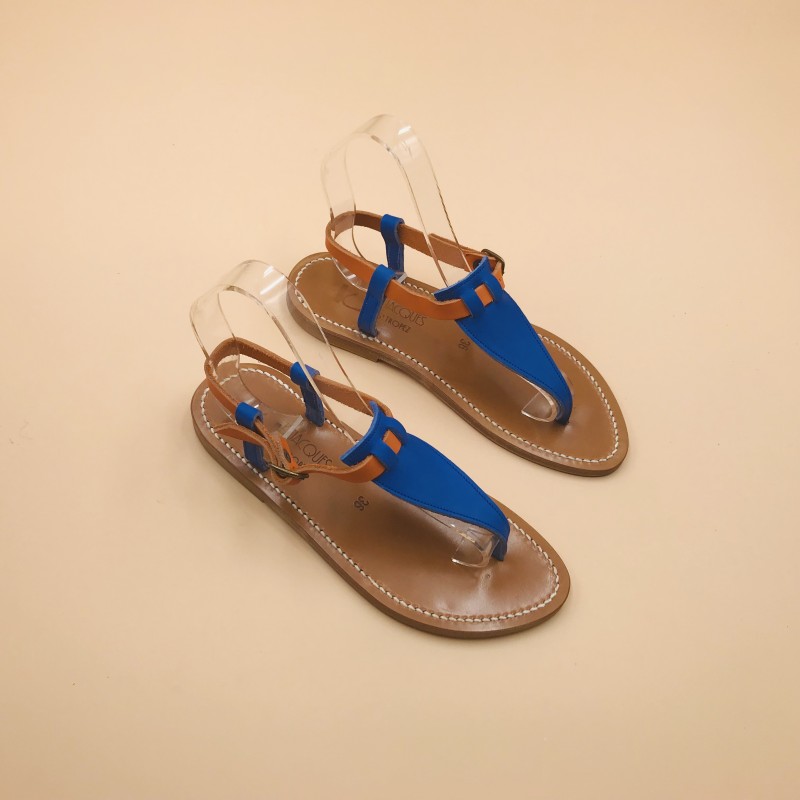 Sandales plates K.JACQUES, modèle CORIOLAN en cuir Pul Azur Mandarine, pointure 36.