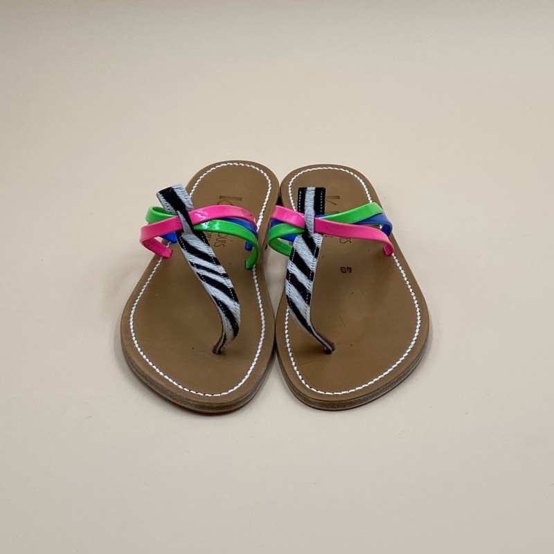 Sandales plates K.JACQUES, modèle PAPYRUS en cuirs Imprimé Zèbre Fluo Rose Bleu Vert pointure 40.