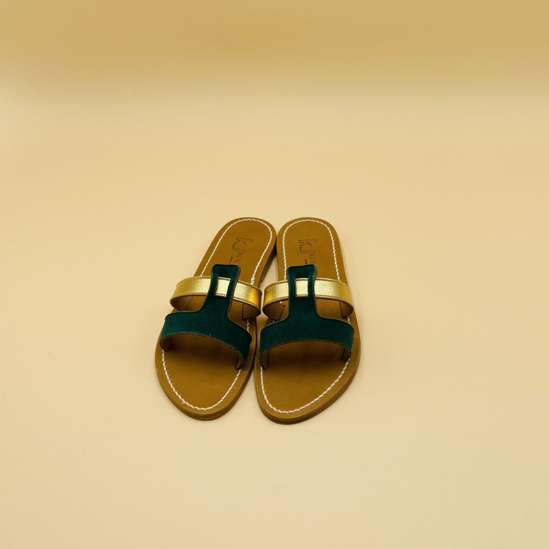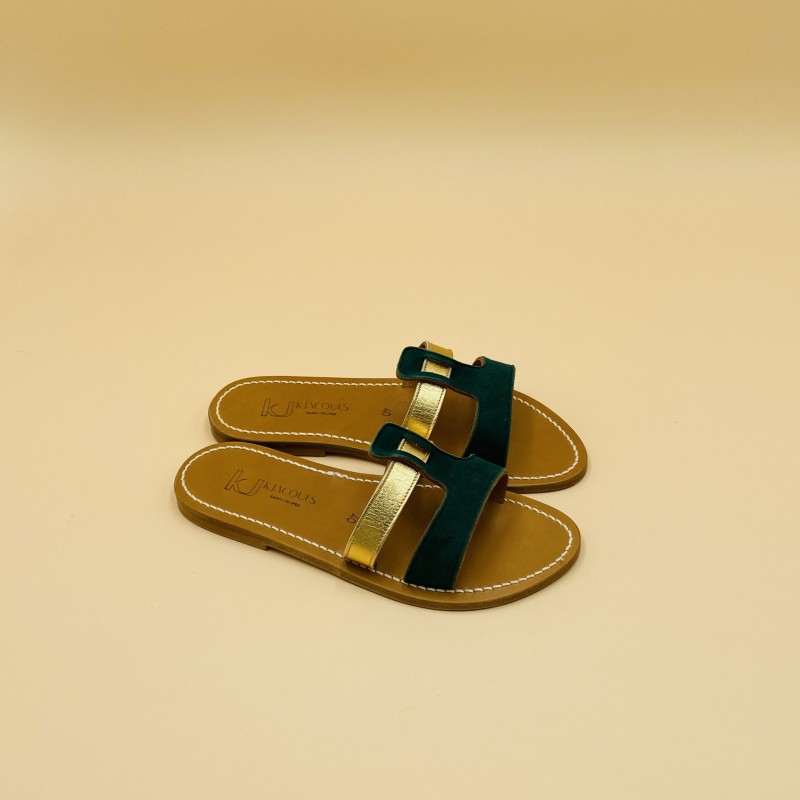 Sandales plates K.JACQUES, modèle THANOS en cuirs Velours Evergreen et Métal Or pointure 40.