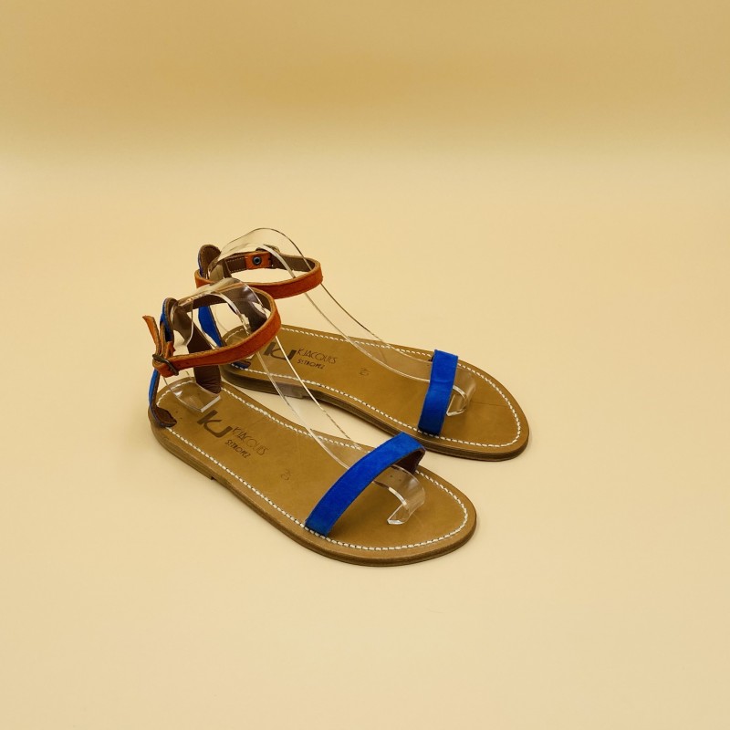 Sandales plates K.JACQUES, modèle LAURA en cuirs Velours Naranja et Velours Azulo pointure 40.