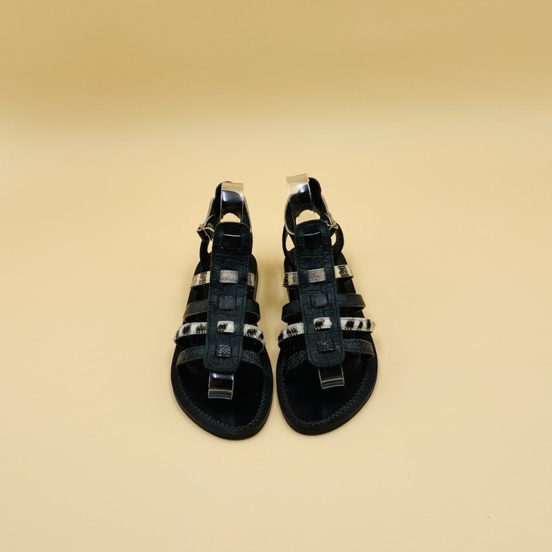 Sandales plates K.JACQUES, modèle PARYS en cuir Combi Tiles Noir sur semelle EBENE pointure 38.